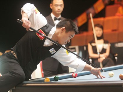 2006716日,生力亚洲九球巡回赛-广州表演站,在广东电视台演播大厅进行。中国的美女球手潘晓婷也参加了比赛。图为中国队徐猛在比赛中。