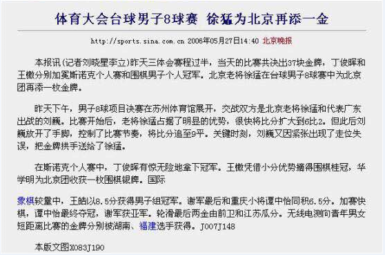 体育大会男子8球赛结束 老将徐猛为北京再添一金
